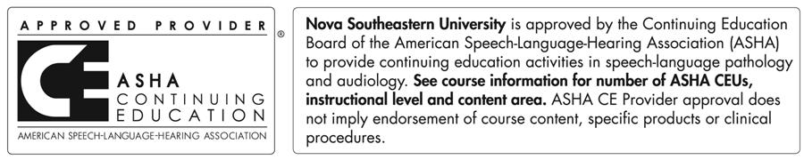 This course has been approved for 13 Contact Hours / 1.3 CEUs by the American Speech-Hearing Association (ASHA) as an Approved Cooperative Continuing Education Offering with Nova Southeastern University (NSU), approved provider of continuing education by theAmerican Speech-Hearing Association (ASHA) (ASHA CE Provider approval does not imply endorsement of course content, specific products, or clinical procedures)